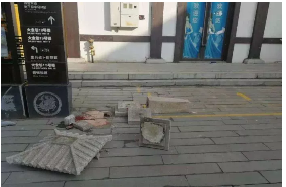 小永出事后,有人拍下了现场的视频。记者从视频中看到,石头灯柱散了架,分成了7部分,散落的石块中有一摊血。