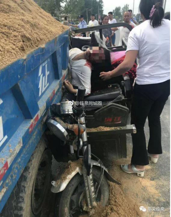 网友报料,庙岔附近发生一起交通事故,一辆三轮车追尾拉沙子的农用车,三轮车女司机当场死亡。